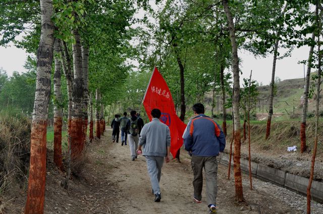 車輪滾滾,約兩小時的疾奔,四輛大巴載著我們歡愉的心,終于到了徒步的起點——攔隆口鄉上營村。此地是一處鄉野田間,綠油油的麥苗翠綠翠綠,直挺挺的白楊一排一排,泥土的清新沁人心脾,田園如一幅油畫在視野中鋪展開來。