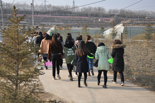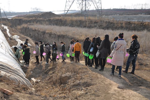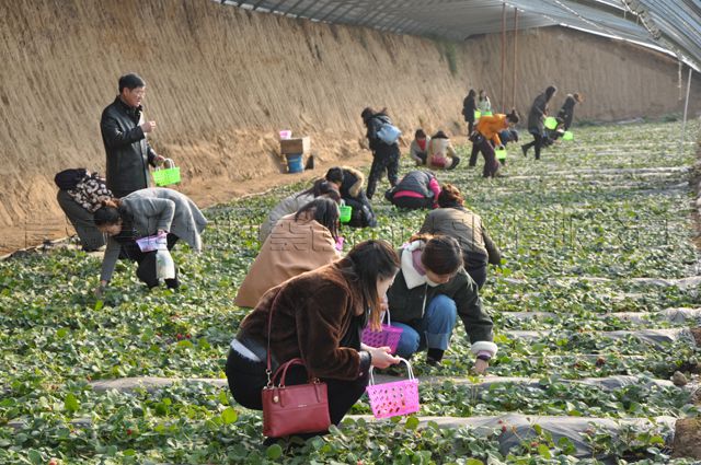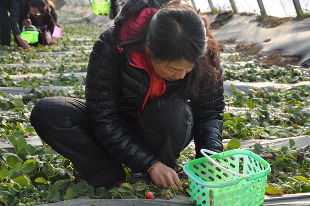 大巴車開進生態園大門,一下車,映入眼簾的是一派特色濃郁的鄉土氣息,一排排整齊的溫室大棚格外引人注目。大家高高興興地集中在一起,公司黨委書記沈波立和黨辦主任兼女工主任宋景娥分別說了采摘活動的主要事項,園摘工作人員交代了采摘過程中的操作程序,隨后,帶著全體女員工往采摘大棚走去。約200米的鄉間小路,處處散發著鄉土的氣息,盡管乍暖還寒,空氣中還浸襲著絲絲涼意,但大家的心一直洋溢著溫暖的節日情調。大家迎著節日的朝陽,吮吸著少有的田間空氣,一會兒功夫,幾個外罩白塑料的溫室大棚赫然出現在眼前,這就是先要采摘的草莓大棚。每個人拎上分發的塑料筐,彎腰進入溫棚內。陽光透過塑料大棚,給本來就很潮熱的大棚罩上了一層三亞之感,是呀!溫棚因這樣的溫度而造就,從室外到棚內,剛剛還是寒襲的冬季,一下子像是被空運到海南島似的。那凸凹有致的綠色田梗,星星點點的紅紅草莓躲藏在綠葉之中,零零散散的小白花陪伴著成熟的紅。這詩意的紅、綠、白,醉染著我們的身心,迫不及待的心拉下了忍不住的手,大家一會彎著,一會蹲著,累了站一會,馬上又繼續采摘……