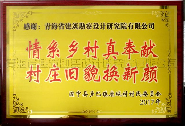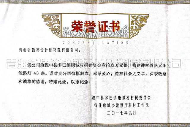 2017年10月26日,湟中縣多巴鎮康城村村民委員會頒給公司一塊獎牌和一本榮譽證書。獎牌上“情系鄉村真奉獻,村莊舊貌換新顏”的十四個紅紅的大字顯得十分醒目。“貴公司為湟中縣多巴鎮康城村捐贈資金壹拾玖萬元整,修建進村道路太陽能路燈43盞。謹對貴公司慷慨解囊、奉獻愛心,造福社會之義舉,深表敬意和誠摯的感謝。特贈此證,以志紀念”,榮譽證書上暖暖的一番話,記錄了公司對聯點幫扶村——康城村的真幫扶和真愛心,也表達了康城村村民對公司的一片感恩之情。